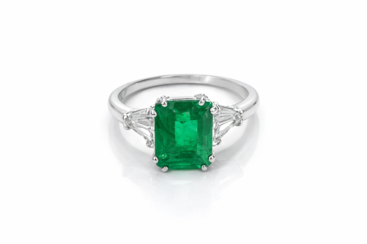 Anello oro bianco 18 kt con smeraldo centrale da 2,90ct e 2 diamanti laterali taglio triangolare da 0,60 ct l'uno