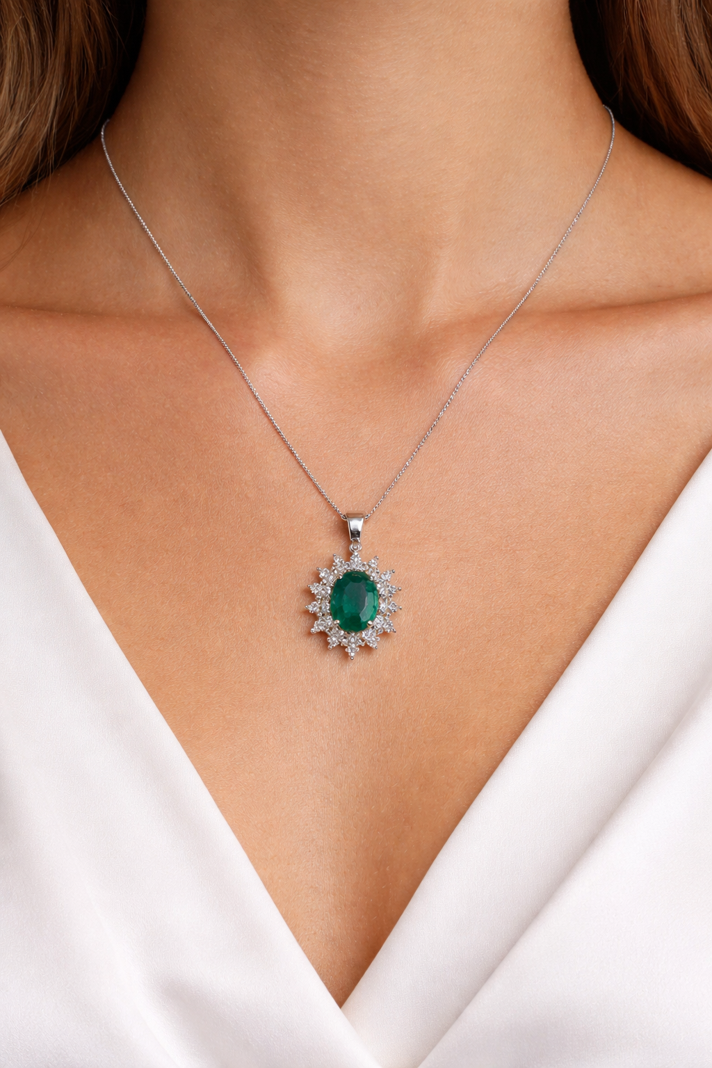 Collana in oro bianco 18 kt con ciondolo a fiore con doppio giro di diamanti taglio brillante da 0,70ct