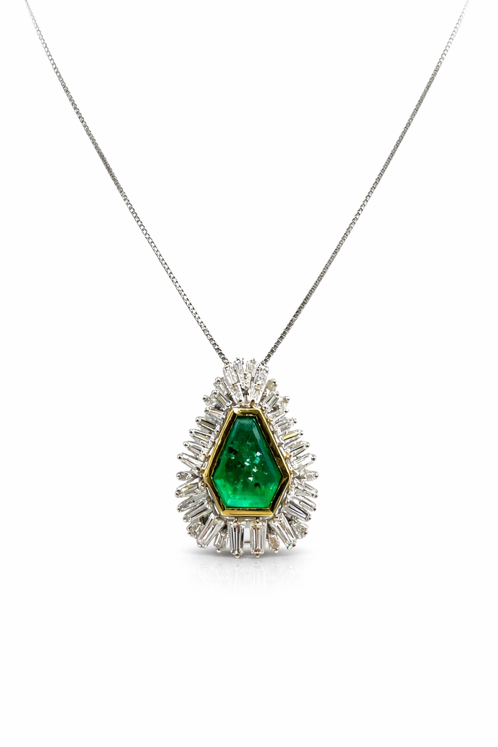 Un gioiello nuovo, certificato e garantito, perfetto per chi cerca una collana con smeraldo di grande caratura affiancato da diamanti luminosi dal design senza tempo.